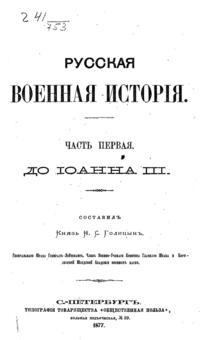 Голицын решил восполнить этот пробел по примеру собственной «Всеобщей военной истории», первой обобщающей работе на эту тему. Неразрывно связывая движение военной истории с политическими событиями, он описывает причины и последствия разных отечественных походов и войн, и вместо чисто теоретического научного пособия создает увлекательнейшую познавательную работу по всему русскому военному прошлому. По мысли самого Голицына, именно России принадлежит особое место в мире, как самобытной, обширнейшей и могущественнейшей из славянских держав, способной поддержать равновесие с другими «мирами», прежде всего германским.