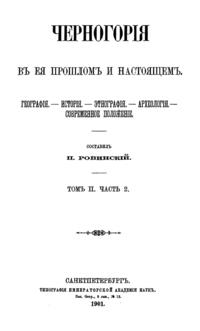 Черногория в ее прошлом и настоящем» - крупнейший вклад в науку известного русского ученого-слависта, этнографа и журналиста. П.А. Ровинский с 1879 по1906 с небольшими перерывами жил в Черногории, где сотрудничал в русской дипломатической миссии и изучал историю и этнографию страны. В своем капитальном труде он обобщает результаты своих многолетних исследований.