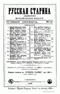 «Русская старина», ежемесячный исторический журнал, выходил в Петербурге в 1870-1918. Основан, издавался и редактировался (1870-1892) М. И. Семевским при участии В. И. Семевского. Последующими редакторами были Н. К. Шильдер (1892-1896), Н. Ф. Дубровин (1896-1904), военные историки С. П. Зыков, П. Н. Воронов.