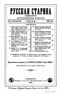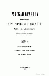 «Русская старина», ежемесячный исторический журнал, выходил в Петербурге в 1870-1918. Основан, издавался и редактировался (1870-1892) М. И. Семевским при участии В. И. Семевского. Последующими редакторами были Н. К. Шильдер (1892-1896), Н. Ф. Дубровин (1896-1904), военные историки С. П. Зыков, П. Н. Воронов.