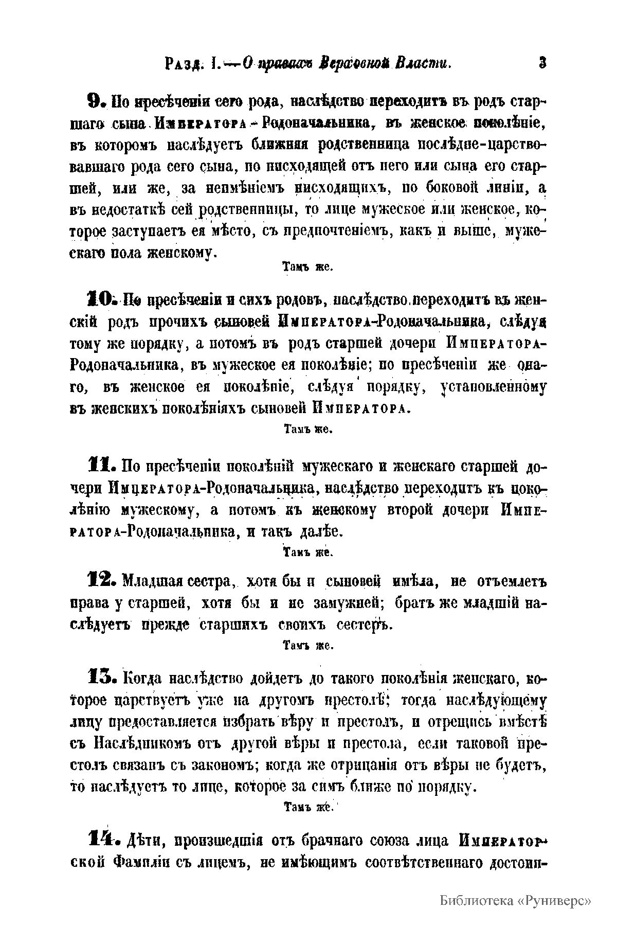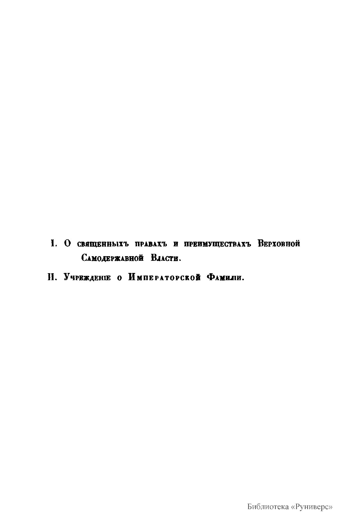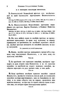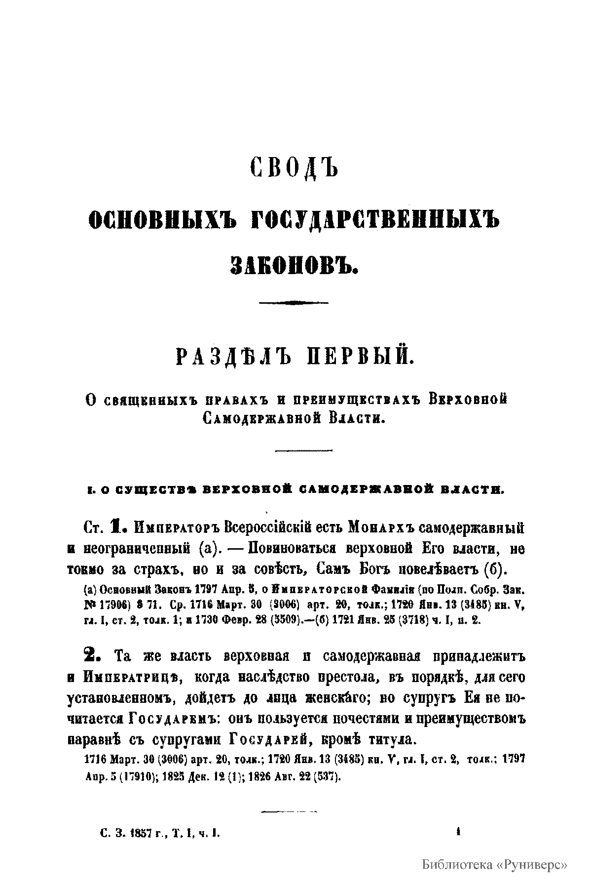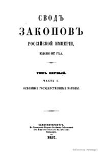 Свод законов Российской империи— официальное собрание расположенных в тематическом порядке действующих законодательных актов Российской империи, созданное при Николае I. Впервые он был напечатан в 1832 году. Манифестом 31 января 1833 года Свод законов был объявлен действующим источником права с 1 января 1835 года. Первое издание 1832 года и последующие 1842-го и 1857 года состояли из пятнадцати томов. После 1857 года Свод законов полностью не переиздавался, а выходили лишь отдельные тома. В качестве отдельного – 16-го тома в 1885 году вышли Судебные уставы. Между изданиями Свода законов выходили ежегодные и сводные (за несколько лет) «Продолжения» Свода законов с указанием на упраздненные и измененные статьи. В своде законов собраны все реально действовавшие в определенный момент времени законы по тем или иным проблемам права, это справочник для юристов. Отбор законодательного материала для включения в Свод производился на основе Полного собрания законов (первое Полное собрание законов, появившееся в 1830 году, состояло из 45 томов, содержащих 30 920 актов и 6 томов приложений). Собрание законов – это в большой степени историческое издание. По нему можно изучать развитие, направление правительственной мысли в стране. Это летопись отечественного законотворчества. Изучая страницу за страницей эту летопись, мы можем узнать, что в тот или иной момент истории являлось злобой дня.