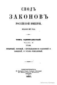 Свод законов Российской империи. Том одиннадцатый. Часть II. Уставы кредитный, торговый, о промышленности фабричной и заводской, и устав ремесленный