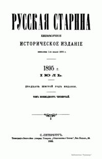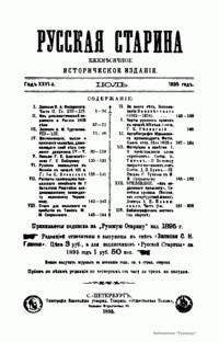«Русская старина», ежемесячный исторический журнал, выходил в Петербурге в 1870-1918. Основан, издавался и редактировался (1870-1892) М. И. Семевским при участии В. И. Семевского. Последующими редакторами были Н. К. Шильдер (1892-1896), Н. Ф. Дубровин (1896-1904), военные историки С. П. Зыков, П. Н. Воронов.