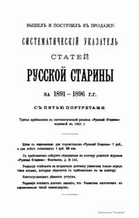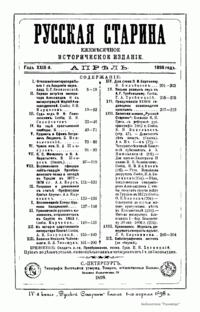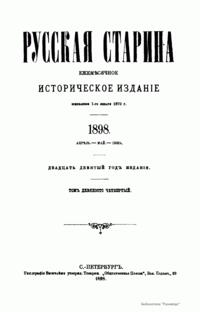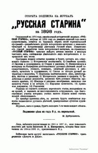 «Русская старина», ежемесячный исторический журнал, выходил в Петербурге в 1870-1918. Основан, издавался и редактировался (1870-1892) М. И. Семевским при участии В. И. Семевского. Последующими редакторами были Н. К. Шильдер (1892-1896), Н. Ф. Дубровин (1896-1904), военные историки С. П. Зыков, П. Н. Воронов.