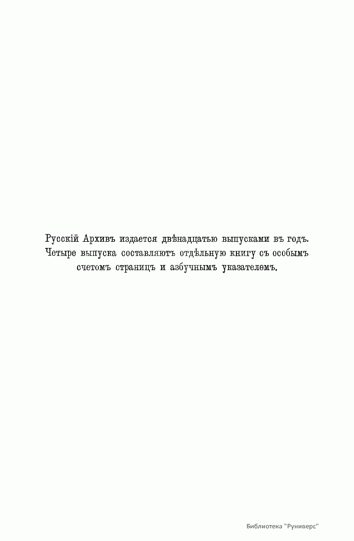 «Русский архив» — ежемесячный историко-литературный журнал, издававшийся в Москве с 1863 по 1917 год. Создателем и продолжительные годы редактором журнала был П. И. Бартенев – историк, археограф, библиограф. Этот журнал называли «живой картиной былого», поскольку он содержал преимущественно публикации неизданных мемуарных, эпистолярных, литературно-художественных и ведомственных документальных материалов, освещавших культурную и политическую историю России в XVIII и XIX вв. По числу опубликованных источников «Русский архив» стоит на первом месте среди русских исторических журналов.
