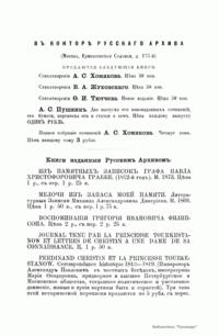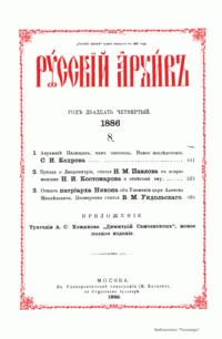 «Русский архив» — ежемесячный историко-литературный журнал, издававшийся в Москве с 1863 по 1917 год. Создателем и продолжительные годы редактором журнала был П. И. Бартенев – историк, археограф, библиограф. Этот журнал называли «живой картиной былого», поскольку он содержал преимущественно публикации неизданных мемуарных, эпистолярных, литературно-художественных и ведомственных документальных материалов, освещавших культурную и политическую историю России в XVIII и XIX вв. По числу опубликованных источников «Русский архив» стоит на первом месте среди русских исторических журналов.