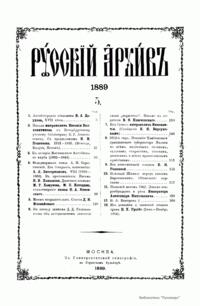 «Русский архив» — ежемесячный историко-литературный журнал, издававшийся в Москве с 1863 по 1917 год. Создателем и продолжительные годы редактором журнала был П. И. Бартенев – историк, археограф, библиограф. Этот журнал называли «живой картиной былого», поскольку он содержал преимущественно публикации неизданных мемуарных, эпистолярных, литературно-художественных и ведомственных документальных материалов, освещавших культурную и политическую историю России в XVIII и XIX вв. По числу опубликованных источников «Русский архив» стоит на первом месте среди русских исторических журналов.