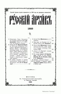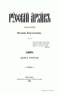 «Русский архив» — ежемесячный историко-литературный журнал, издававшийся в Москве с 1863 по 1917 год. Создателем и продолжительные годы редактором журнала был П. И. Бартенев – историк, археограф, библиограф. Этот журнал называли «живой картиной былого», поскольку он содержал преимущественно публикации неизданных мемуарных, эпистолярных, литературно-художественных и ведомственных документальных материалов, освещавших культурную и политическую историю России в XVIII и XIX вв. По числу опубликованных источников «Русский архив» стоит на первом месте среди русских исторических журналов.