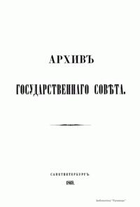 В 1863 г. по высочайшему повелению Александра II началась работа над систематическим описанием архива Государственного совета и Государственной канцелярии. Эта работа была поручена сенатору, историку-юристу Н. В. Калачову и советнику И. А. Чистовичу под высшим наблюдением председателя Государственного совета Д. Н. Блудова. Под их редактурой вышли в свет три тома (восемь книг) «Архива государственного совета»: две части первого тома, охватывающие период с 1768 по 1796 г. и заключающие в себе протоколы Совета, учрежденного императрицей Екатериной II; две части четвертого тома, содержащие журналы Государственного совета по Департаменту законов с 1810 по 1825 г.; две части третьего тома, в которые вошли протоколы Совета при Высочайшем дворе с 1801 по 1810 г.; две части четвертого тома, включающие журналы Государственного совета по Департаменту экономии с 1810 по 1825 г. Со смертью главного редактора издания сенатора Калачова публикация архива была приостановлена. С учетом исторической ценности данного труда, в 1886 г. последовало высочайшее повеление продолжить работу над изданием. Его составление и редактирование было возложено на члена Археографической комиссии Министерства народного просвещения Г. Ф. Штендмана, помощника статс-секретаря Государственного совета П. М. фон Кауфмана и др. В продолжение работы над изданием были опубликованы: третья часть четвертого тома, содержащая материалы по гражданскому отделению Департамента законов (1818–1820); пять частей четвертого тома, в который вошли журналы по Департаменту гражданских и духовных дел (1810 – 19 ноября 1825 г.); первая часть пятого тома, включающая журналы по делам Департамента государственной экономии (20 ноября 1825 г. – 1826).