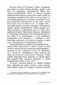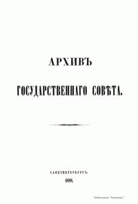 В 1863 г. по высочайшему повелению Александра II началась работа над систематическим описанием архива Государственного совета и Государственной канцелярии. Эта работа была поручена сенатору, историку-юристу Н. В. Калачову и советнику И. А. Чистовичу под высшим наблюдением председателя Государственного совета Д. Н. Блудова. Под их редактурой вышли в свет три тома (восемь книг) «Архива государственного совета»: две части первого тома, охватывающие период с 1768 по 1796 г. и заключающие в себе протоколы Совета, учрежденного императрицей Екатериной II; две части четвертого тома, содержащие журналы Государственного совета по Департаменту законов с 1810 по 1825 г.; две части третьего тома, в которые вошли протоколы Совета при Высочайшем дворе с 1801 по 1810 г.; две части четвертого тома, включающие журналы Государственного совета по Департаменту экономии с 1810 по 1825 г. Со смертью главного редактора издания сенатора Калачова публикация архива была приостановлена. С учетом исторической ценности данного труда, в 1886 г. последовало высочайшее повеление продолжить работу над изданием. Его составление и редактирование было возложено на члена Археографической комиссии Министерства народного просвещения Г. Ф. Штендмана, помощника статс-секретаря Государственного совета П. М. фон Кауфмана и др. В продолжение работы над изданием были опубликованы: третья часть четвертого тома, содержащая материалы по гражданскому отделению Департамента законов (1818–1820); пять частей четвертого тома, в который вошли журналы по Департаменту гражданских и духовных дел (1810 – 19 ноября 1825 г.); первая часть пятого тома, включающая журналы по делам Департамента государственной экономии (20 ноября 1825 г. – 1826).
