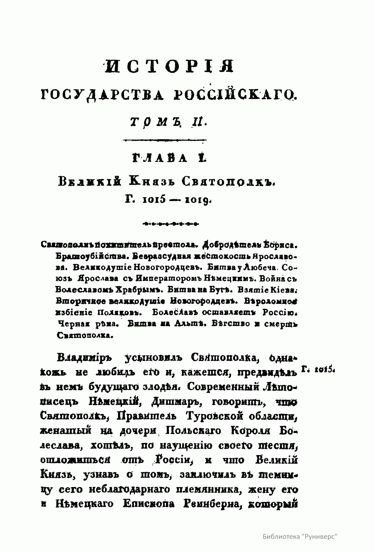В 1816 году он выпустил первые восемь томов «Истории государства Российского», трёхтысячный тираж которых разошелся в течение месяца. В последующие годы вышли еще три тома «Истории», появился ряд переводов её на главнейшие европейские языки. Тенденциозно-монархическое освещение русского исторического процесса сблизило Карамзина с двором и царем, поселившим его подле себя в Царском Селе. Незаконченный XII том был издан уже после его смерти.