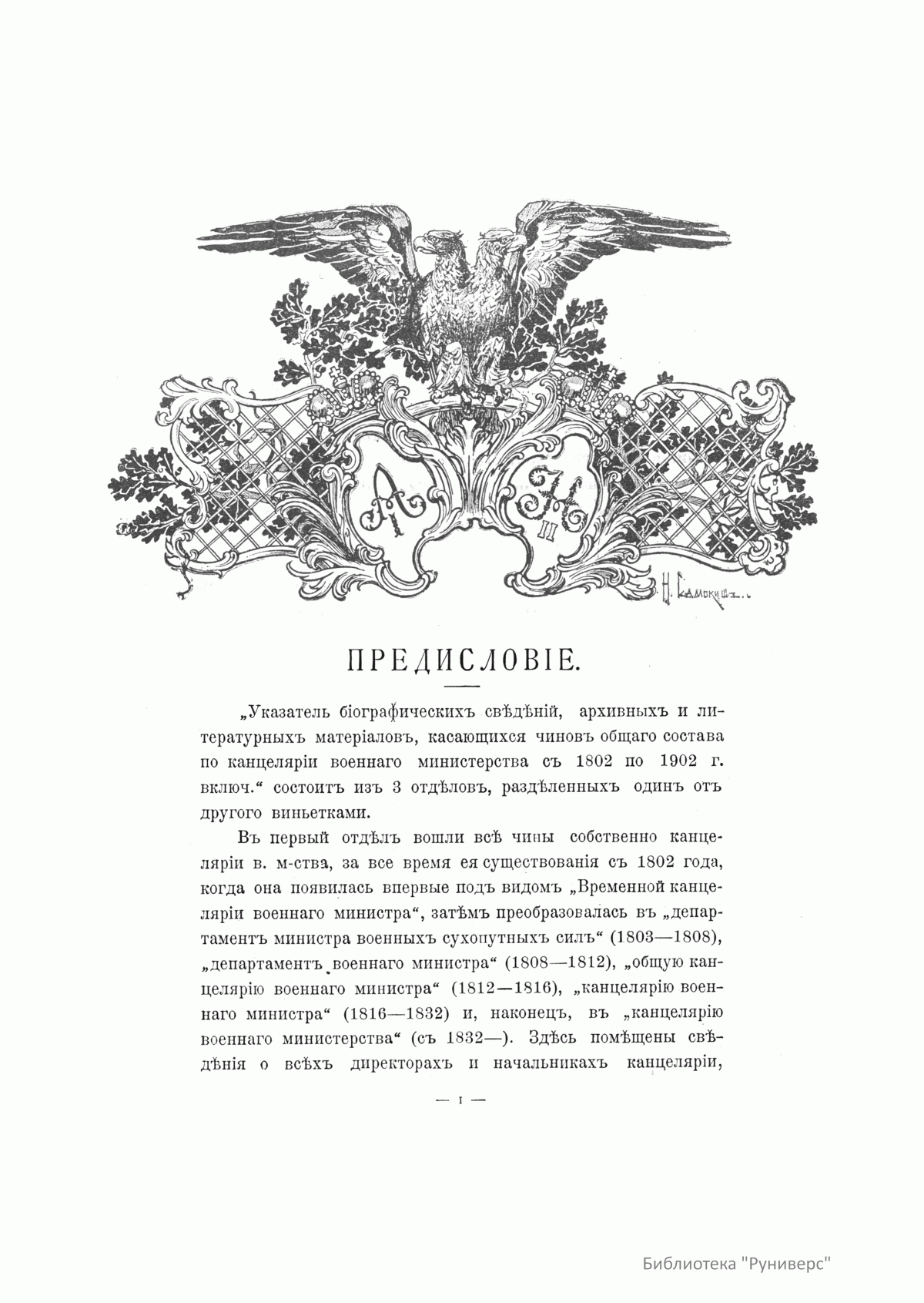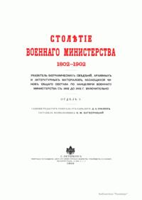 Столѣтiе военнаго министерства. 1802-1902. Указатель бiографическихъ свѣдѣнiй, архивныхъ и литературныхъ матерiаловъ, касающихся чиновъ общаго состава по канцелярiи военнаго министерства съ 1802 до 1902 г. включительно. Книга 1
