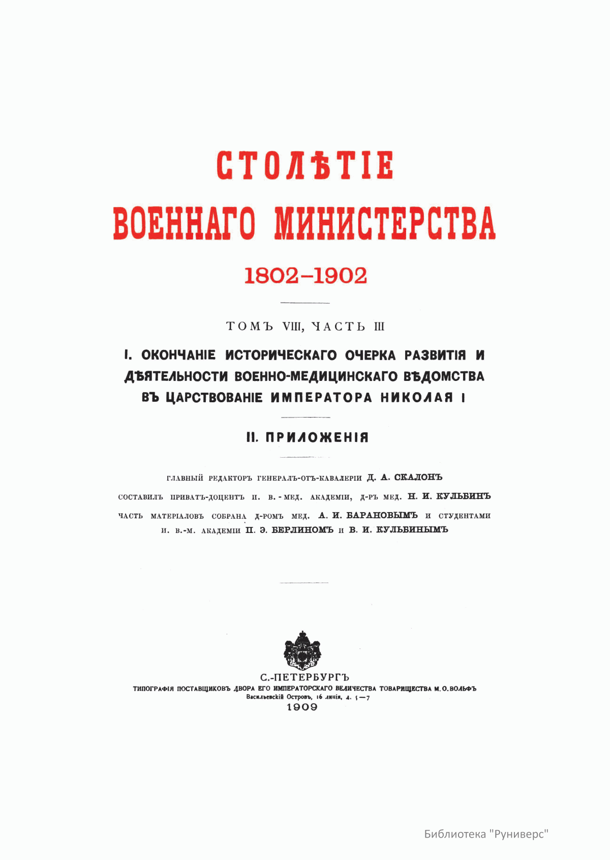 Столетие военного министерства. 1802-1902. Окончание исторического очерка развития деятельности военно-медицинского ведомства в царствование Императора Николая I. Приложения