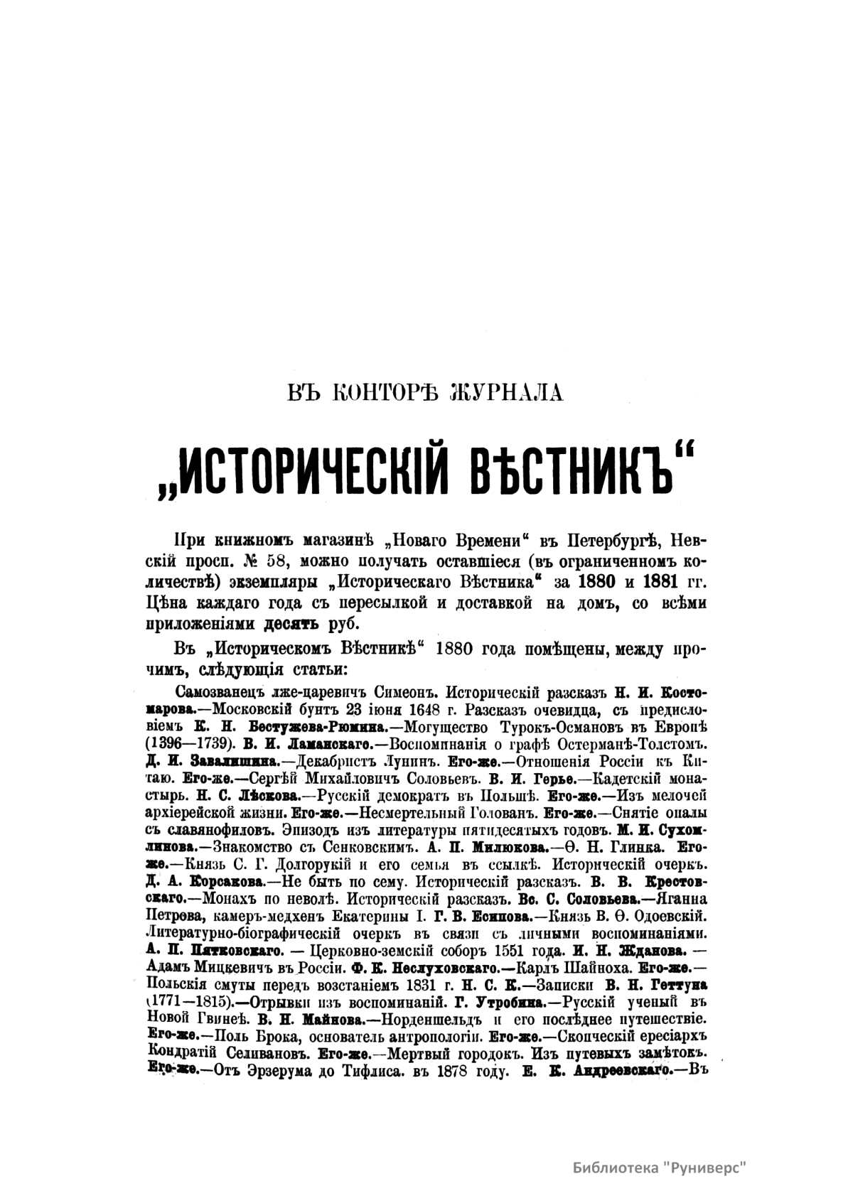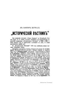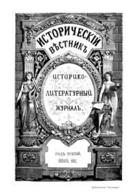 «Исторический вестник» - русский ежемесячный историко-литературный журнал. Издавался в Санкт-Петербурге с 1880-го по 1917 г. Журнал был основан А.С. Сувориным и С.Н. Шубинским с целью «знакомить читателей в живой, общедоступной форме с современным состоянием исторической науки и литературы в России и Европе». Вышло 150 тт. Каждый том состоял из трёх ежемесячных выпусков, имел свою нумерацию страниц, оглавление, список иллюстраций. Журнал приобрёл устойчивую популярность среди читателей, заняв прочное место в «триумвирате» русских исторических журналов наряду с «Русским архивом» и «Русской стариной». опережая их по количеству подписчиков. Отличием «Исторического вестника» было то, что он не помещал на своих страницах необработанных, сырых материалов. С другой стороны, журнал приближался по своему типу к журналам общелитературного образца, сочетая в себе коммерческий успех и доступное изложение материала.