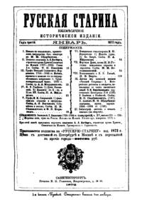 «Русская старина», ежемесячный исторический журнал, выходил в Петербурге в 1870-1918. Основан, издавался и редактировался (1870-1892) М. И. Семевским при участии В. И. Семевского. Последующими редакторами были Н. К. Шильдер (1892-1896), Н. Ф. Дубровин (1896-1904), военные историки С. П. Зыков, П. Н. Воронов.