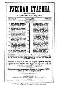 «Русская старина», ежемесячный исторический журнал, выходил в Петербурге в 1870-1918. Основан, издавался и редактировался (1870-1892) М. И. Семевским при участии В. И. Семевского. Последующими редакторами были Н. К. Шильдер (1892-1896), Н. Ф. Дубровин (1896-1904), военные историки С. П. Зыков, П. Н. Воронов.