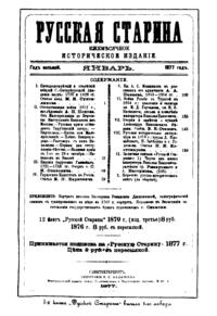 «Русская старина», ежемесячный исторический журнал, выходил в Петербурге в 1870-1918. Основан, издавался и редактировался (1870-1892) М. И. Семевским при участии В. И. Семевского. Последующими редакторами были Н. К. Шильдер (1892-1896), Н. Ф. Дубровин (1896-1904), военные историки С. П. Зыков, П. Н. Воронов.