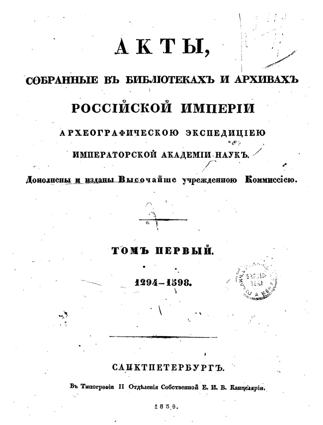 Историко-юридические акты (древние грамоты, указы, наказные памяти, отписки, судные дела, розыски и проч.) конца XIII – XVIII в., собранные экспедицией Императорской академии наук 1829 – 1834 гг. под руководством археолога Г. Строева в архивах монастырей и городов Северовосточной и Средней России, дополнены некоторыми неизвестными ранее документами из Санкт-Петербургских библиотек и Московского главного архива Министерства иностранных дел. Всего опубликовано 1296 актов.