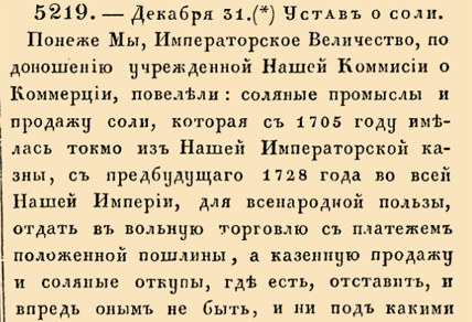 5219. 1728 год. 11 января (31 декабря 1727 года ст.ст.) Устав о соли. Понеже Мы, Императорское Величество, по доношению учрежденной Нашей Коммисии о Коммерции, повелели: соляные промыслы и продажу соли, которая с 1705 году имелась токмо из Нашей Императорской казны, с предбудущаго 1728 года во все Нашей Империи, для всенародной пользы, отдать в вольную торговлю с платежом положенной пошлины, а казенную продажу и соляные откупы, где есть, оставить, и впредь оным не быть, и ни под какими вымыслами не всчинать, дабы верные Наши подданные купечество не токмо от служеб при казенной соляной продаже бывших были свободны, но и капиталом, состоявшим в соляном торгу и продажею и меною на соль прочих товаров размножая Коммерцию пользовались, а крестьянство и градские обыватели, всяк куплею соли на деньги, или на мену товаров от своих домашних плодов т трудов пр