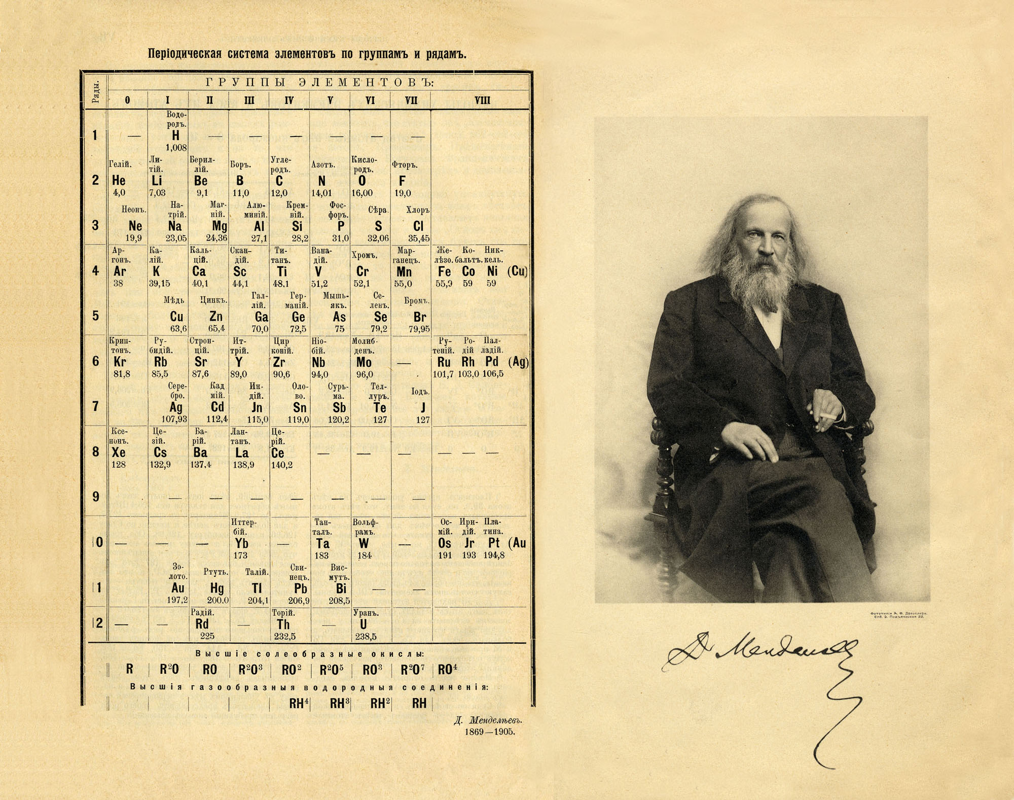 Менделеев и периодическая таблица. Иллюстрация из книги: Менделеев Д. И. Основы Химии. Спб.: Типо-литография М. П. Фроловой, 1906