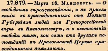 17879. 1797 год. 18 марта (29 марта). Манифест. О свободном вероисповедании, о не привлекании в присоединенных от Польши Губерниях людей из Грекороссийской веры в Католическую