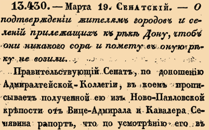 13430. 1770 год. 30 марта (19 марта ст.ст.) Сенатский. О подтверждении жителями городов и селений прилежащих к реке Дону, чтоб они никакого сору и помету в оную реку не возили.Правительствующий Сенат, по доношению Адмиралтейской-Коллегии, в коем прописывается полученной ею из Ново-Павловской крепости от Вице-Адмирала и Кавалера Сенявина рапорт, что по усмотрению его в бытность в Павловске из тамошней крепости возят разный сор и помет на реку Дон, и как таковое засорение от города происходит, то уже от лежащих по той реке сел и деревень, где нет тому смотрителей, и паче может быть, от чего, как из описания видно, против прошлых лет река Дон мельчае и более банков имеет <+>