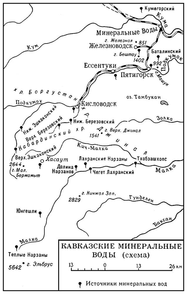 Николаевские и Ермоловские ванны в Пятигорске. Открытка 19 века.В 1801-1802 годах химик Симсен, аптекарь Швенсон, штаб-лекари Гординский и Крушневич изучили химический состав нарзана и пятигорских углекисло-сероводородных вод. В заключении химика Симсена было сказано, что кавказские минеральные воды обладают благотворным воздействием на больного человека. Исследователи внесли ряд ценных рекомендаций по обустройству источников и заселению ближайших окрестностей, о чем было доложено императору Александру I. Высочайшее повеление императора Александра II Астраханскому военному губернатору князю Павлу Дмитриевичу Цицианову Высочайше утвержденный доклад Министра Внутренних дел. – Об определении к Кавказским минеральным источникам двух врачей с жалованьем.