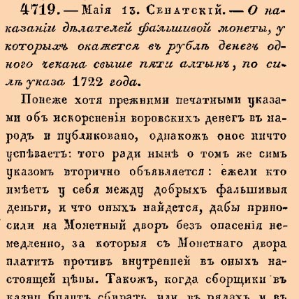 4719. 1725 год. 24 мая (13 мая ст.ст.). Сенатский. О наказании делателей фальшивой монеты, у которых окажется в рубле денег одного чекана свыше пяти алтын, по силе указа 1722 года.Понеже хотя прежними печатными указами об искоренении воровских денег в народ и публиковано, однакож оное ничто успевает: того ради ныне о том же сим указом вторично объявляется: ежели кто имеет у себя между добрых фальшивыя деньги <…>
