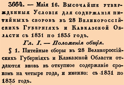 3664. 1830 год. 28 мая (16 мая ст.ст.) Высочайше утвержденныя Условия для содержания питейных сборов в 28 Великороссийских Губерниях и Кавказской Области с 1831 по 1835 год.Глава 1. Положения общия №1 Питейныя сборы в 28 Великороссийских Губрниях и Кавказской Области отдаются вновь в откупное содержание сроком на четыре года. И именно: с 1831 по 1835 год. №2 Торги на сии сборы произведены будут особо на каждый город с уездом; но всякий желающий может взять на откуп столько городов с уездами, сколько за ним за ним с торгов состоится. <…>