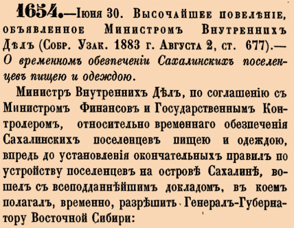 1654. 1883 год. 30 июня (12 июля). Высочайшее повеление, объявленное Министром Внутренних Дел. О временном обезпечении Сахалинских поселенцев пищею и одеждою.