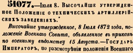 51077. 1872 год. 8 июля (20 июля). Высочайше утвержденное положение о технических артиллерийских заведениях.
