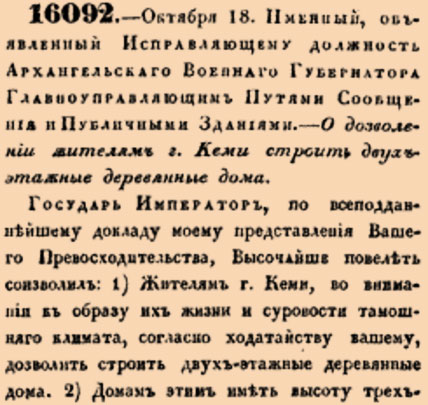 Закон № 16092 — 1842 год 30 октября (18 октября). Указ о разрешении жителям города Кеми строить двухэтажные деревянные дома с соблюдением установленных правил.