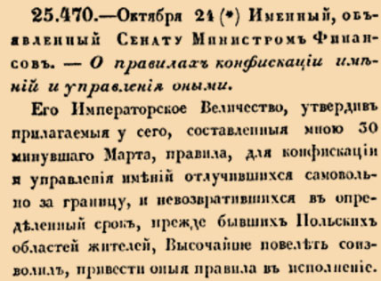 Закон № 25.470. - 1813 год 5 ноября (24 октября). О правилах конфискации и управления имуществом жителей бывших польских областей, самовольно покинувших страну и не вернувшихся в установленный срок.