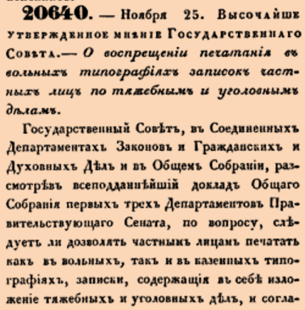 20640. 1846 год. 7 декабря (25 ноября ст.ст.) Высочайше утвержденное мнение Государственнаго Совета. О воспрещении печатания в вольных типографиях записок частных лиц по тяжебным и уголовным.<…> Воспрещаются как одобрение ценсурою к печатанию, так равно и само печатание или литографирование в казенных или вольных типографиях и литографиях всяких записок частных лиц по тяжебным и уголовным делам <…>
