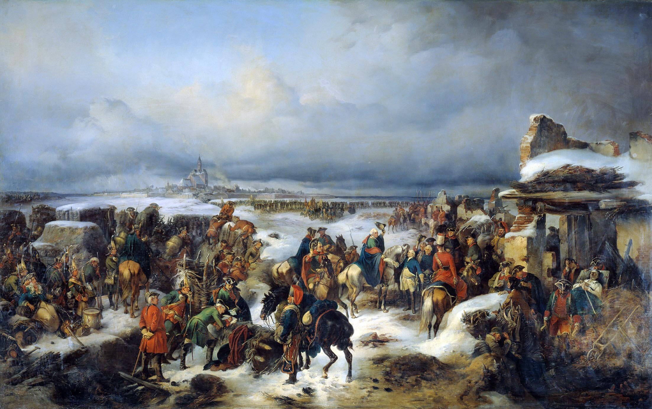 Действовавший отдельно от главной армии корпус Румянцева (18000) 5-го августа подошел к Кольбергу и осадил его. Крепость оказалась сильной и осада, веденная при помощи флота, длилась четыре месяца, сопровождаясь в то же время действиями против прусских партизан в тылу осадного корпуса. Лишь непреклонная энергия Румянцева позволила довести осаду до конца — три раза созванный военный совет высказывался за отступление. Наконец, 5-го декабря Кольберг сдался и это было последним подвигом русской армии в Семилетнюю войну...