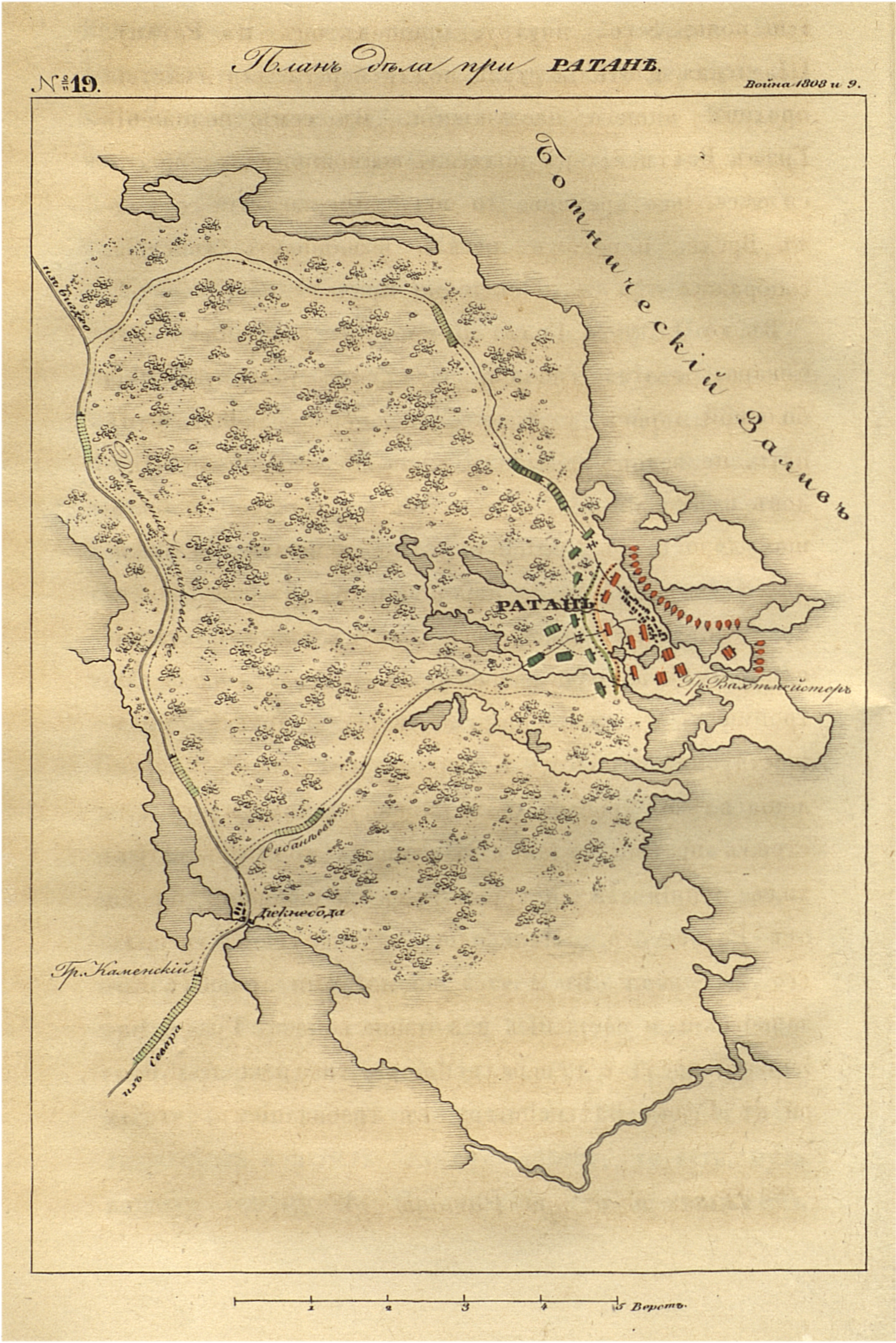 Граф Вахтмейстер не согласился сдаться, но устрашенный угрозою, просил позволения сесть свободно на суда. Граф Каменский отказал и в 4 часа начал атаку на двух пунктах, по дорогам, по которым пришел его корпус. Тесня Шведских стрелков, наши заняли Ратан и стреляли оттуда по судам. Шведы поспешно обратились к своему Флоту и открыли с него сильный пушечный огонь, препятствуя нам подаваться вперед и преследовать неприятеля, садившегося на суда. Наши вывезли из Ратана два орудия на поляну; пушки не могли удержаться, и после нескольких выстрелов надобно было отодвинуть их назад. Русские ядра не долетали до неприятеля, между тем как Шведы, действуя из тяжелых морских орудий, наносили нам сильный вред. Русские егеря заняли часть берега, покрытую лесами, и стреляла по лодкам. Огонь утих в 11 часов вечера. Ночью Граф Каменский вывел войска из Ратана, потому что они находились под выстрелами Флота. Передовая цепь наша стала в лесу. На следующее утро все Шведы были уже на судах, начиная вытягиваться из гавани.