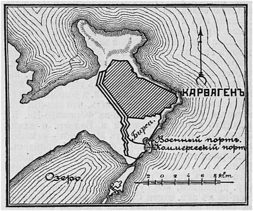 Карфаген (Carthago, Кархедон по-финикийски). Основан по древн. преданиям финикийцами за 50 лет до разрушения Трои, т.-е. ок. 1134 г. до Р. Хр., в той части Сев. Африки, к-рая у римлян называлась Regio Zeugitana. Предание приписывает значит. расширение К. Дидоне, сестре царя Тира, Пигмалиона, бежавшей в К. со своими приближенными от жестокостей брата. К. б. расположен на берегу Средизем. моря, в Тунис. заливе, на полуо-ве, соединявшемся с материком перешейком в 31/2 вер. (25 стадий). Имея продолговато-круглый общий план, город разделялся на 3 части: Мегару, составлявшую самый город, Бирзу (Бирсу) — в его середине, составлявшую цит-ль с глав. святыней, храмом Эскулапа, и Кротон. Сильнейшия укр-ния К. были на южн. стороне. Гавань находилась на з. и разделялась на внешнюю, или купеческую и внутреннюю, — военную. Внутри последней, соединявшейся с торговой каналом 71 фт. шир., на о. Коѳоне находились верфи, арсеналы и магазины. В этой гавани м. помещаться 220 больш. судов, для к-рых имелись спец. сводчатыя закрытия. Обе гавани м. б. заперты при помощи цепей. В К. насчитывалось до 700 т. жит., и окруж-ть города простиралась слишком на. 28 вер. Со стороны суши город защищался тройною стеной (с моря простой) 45 фт. выс., с подымавшимися над нею, через каждые 200—250 ш., 4-ярусн. башнями, 60 фт. выс., к-рыми пользовались, как магазинами. В этих стенах, 30 фт. шир., помещались казармы на 24 т. ч. г-зона, вверху конюшни на 4 т. лош., а внизу стойла на 300 слонов, а также все провиант. магазины.