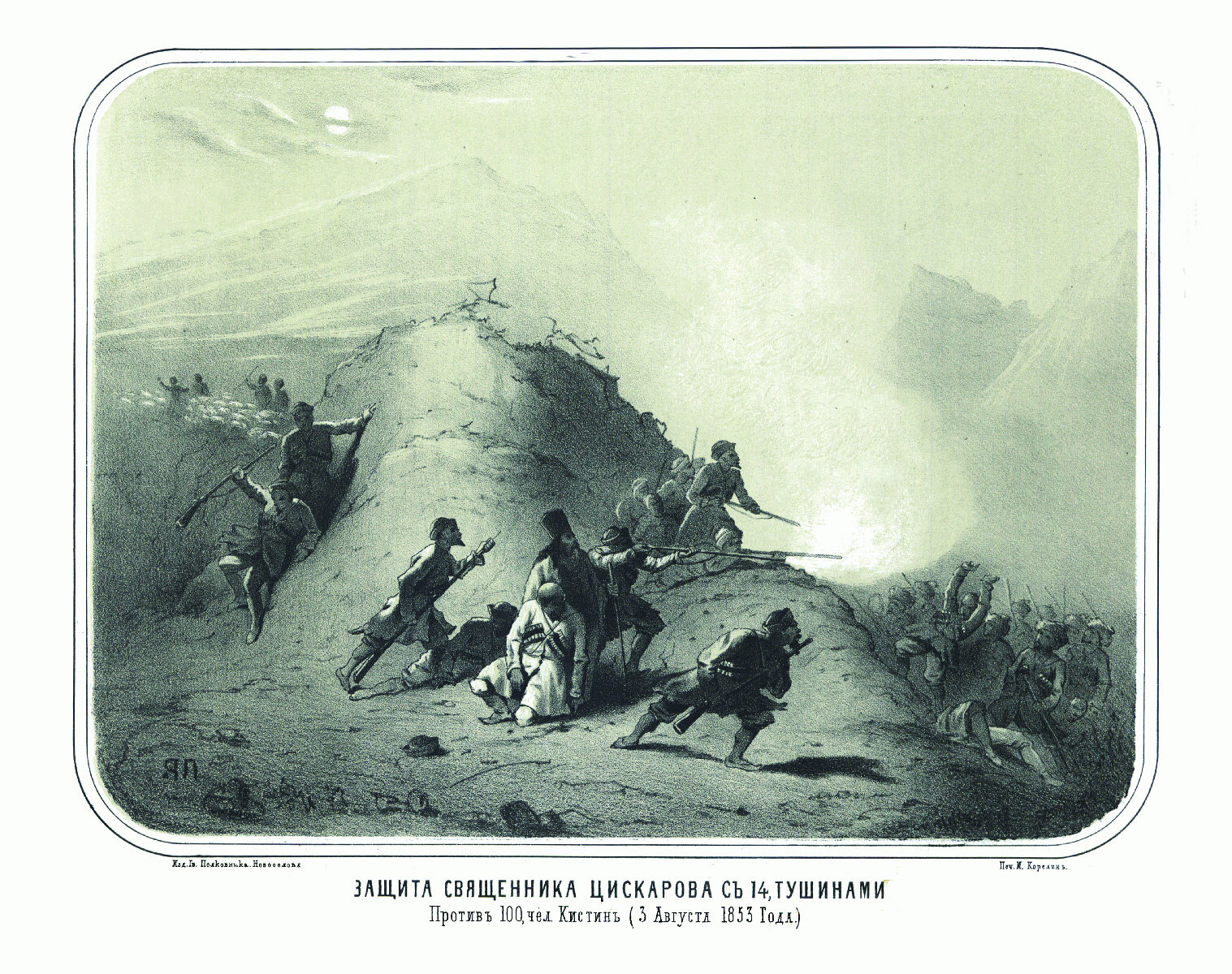 Много известно, в изустных рассказах, примеров безоглядной отваги Тушин; но до сих пор мало из них появлялось в печати, — а если, иногда, они и были доводимы до сведения общего, то в летучих листках легко затеривающихся и недоступных чрез несколько лет после их выхода, Наравне с подвигами православного воинства, «Кавказцы» собирают и дела туземцев, не принадлежащих к составу славной армии, по занимающих столь же почетное место в охранении края и в водворении в нем Русской власти. — На первый раз помещаем примерную защиту четырнадцати Тушин против ста человек Кистин. (Известие об этом подвиге было помещено в газете «Кавказ» 1853 года.— Здесь, кстати, заметим, что некоторых №№ «Кавказа» решительно нельзя нигде достать: их нет в продаже в редакции, нет в Императорской Публичной Библиотеке, нет в библиотеке Академии Наук и на наш вызов, через газеты, не нашлось в С.-Петербурге желающих продать некоторые из прежних годов). 3-го августа 1853 года благочинный Тушино-Пшаво-Хевсурского округа, священник Цискаров, находившийся по делам службы в горной Тушетии, возвращался оттуда, сопровождаемый двумя старшинами Цовского общества. На пути он остановился на ночлег в шалаше 12-ти караульщиков, выставленных Цовским обществом на Сакорне, для занятия тропинок, ведущих из Кистетии в это ущелье. Часов в 9-ть вечера, партия враждебных нам кистин, состоявшая из ста человек, под предводительством известного Кистинского белада Джокола, спустившись Алазаниставским ущельем, пробиралась к урочищу Орцкали и к горе Масара, чтобы угнать пасущиеся там стада баранов. Хищники неожиданно наткнулись на трех секретных караульных, выставленных из числа находившихся на Сакорне. Встреченные выстрелами трех храбрецов, укрепившихся за скалами и упорно защищавшимися, Кистины должны были завязать с ними перестрелку. На выстрелы прибежали остававшиеся на Сакорне Тушины, и, не смутившись многочисленностью неприятеля, ободряемые священником Цискаровым, завели с врагами сильную перестрелку. Напрасно те старались их окружить: Тушины заняли выгодную позицию, и в продолжение полутора-часа задерживали неприятеля. Кистины, по опыту зная обычное упорство Тушин, которые пропустили бы их только чрез свои трупы, и зная также, что, оповещенные эхом выстрелов, к ним могут подоспеть на помощь сторожевые с горы Тбатани, решились отступить. Тогда Тушины, в порыве своей известной храбрости, пустились преследовать удалявшихся врагов. Опять завязалась перестрелка: один Кистин был убит, несколько ранено; Тушины же лишились двух своих храбрых товарищей. Таким образом четырнадцати Тушинам удалось заставить отступить сто человек Кистин и не допустить их угнать стада баранов.