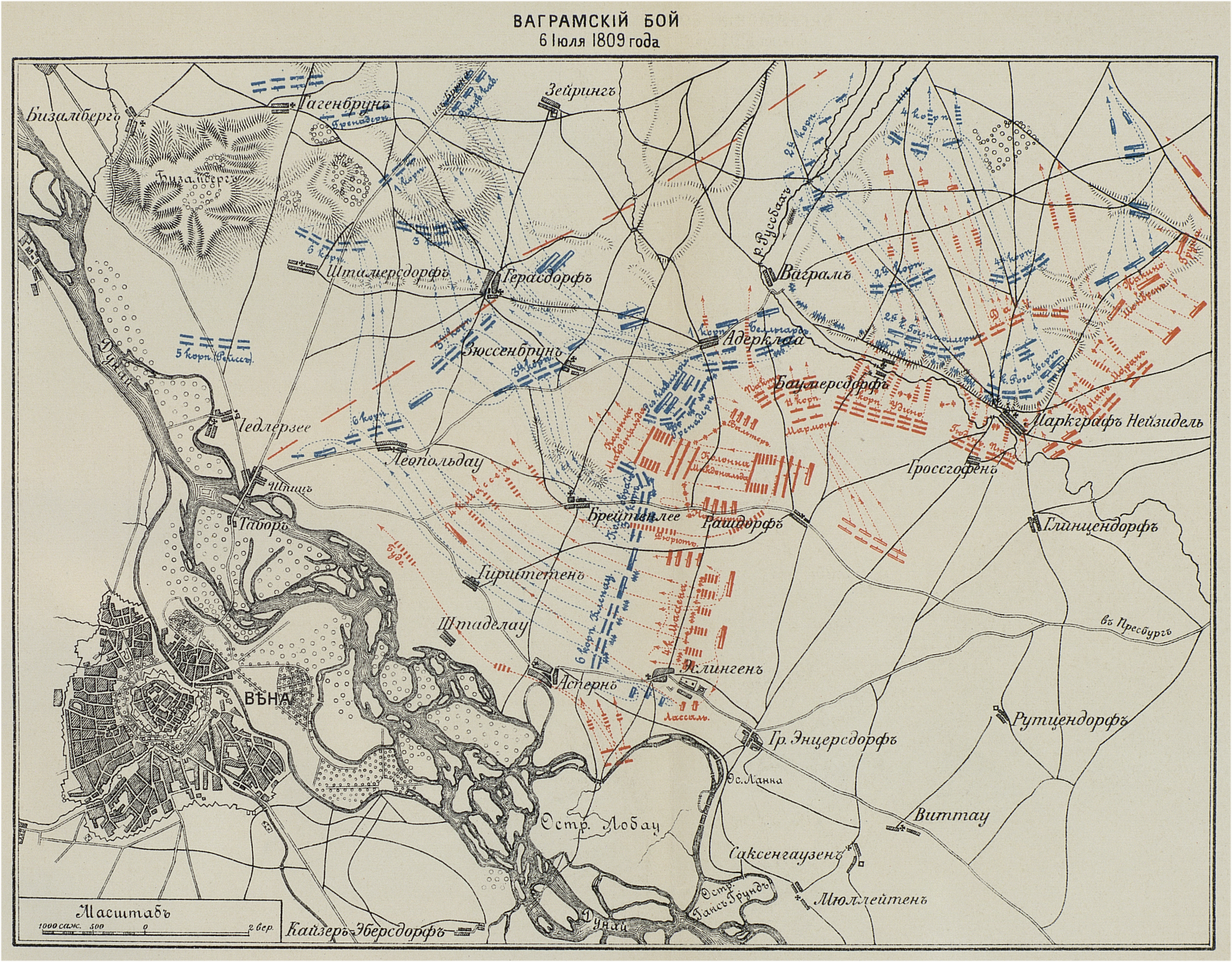 Ободренный успехом, эрц. Карл решил на 6 июля удерживать частью сил лев. фланг Руссбахской позиции, на участке Баумерсдорф — Маркграф-Нейзидель, с ост. же войсками двинуться вперед… Карл разбрасывает свои слабейшия войска равномерно на протяжении 20—25 вер., не оставляя в своем распоряжении резерва. План действий Наполеона состоял в прорыве фронта австрийцев (Бизамберг — Руссбах — Прессбург) в центре и в направлении, ведшем к захвату путей на Моравию (база), Богемию и Венгрию