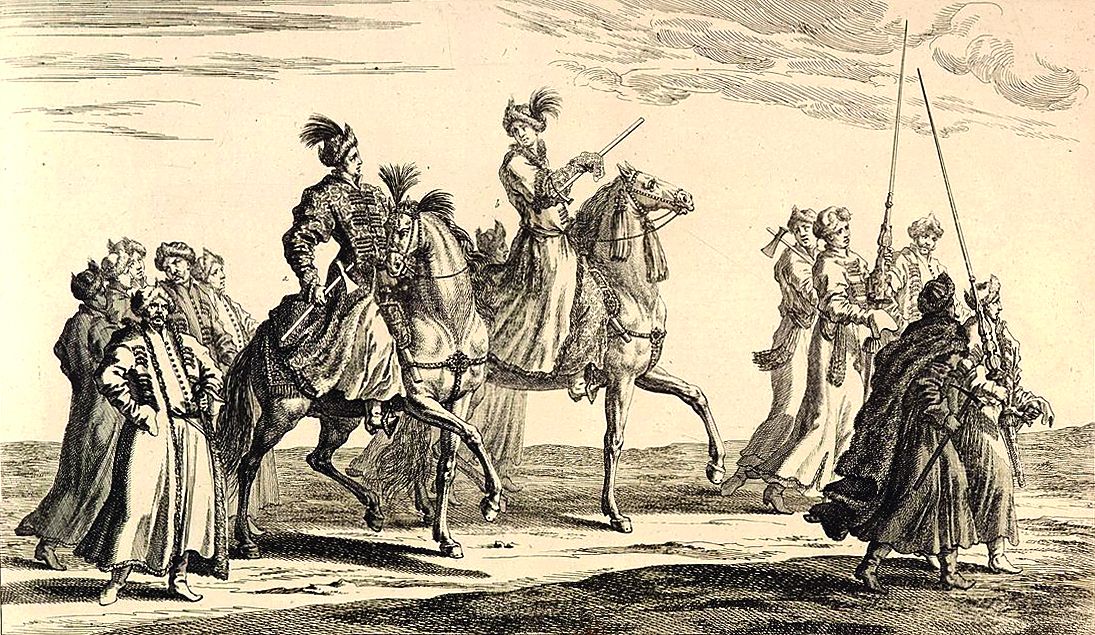 «Польские» всадники с секирками и их свита. Вельможи в польских уборах на торжественной «карусели», посвященной совершеннолетию Карла XI в 1672 г.