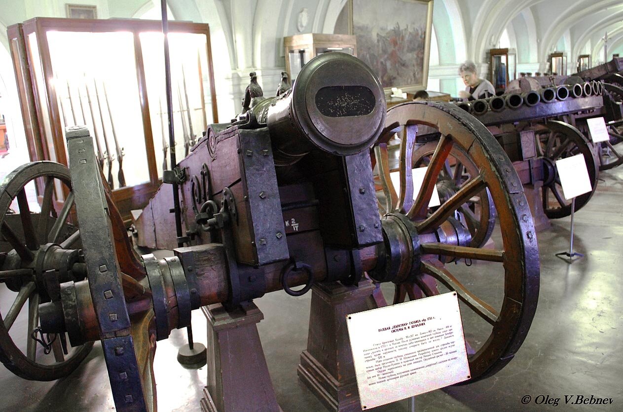 В 1753 г. генерал-фельдцейхмейстер П. И. Шувалов выдвинул идею гаубицы нового типа, предназначенной для борьбы с пехотой и конницей. Разработку ее поручили майору Мусину-Пушкину и мастеру Степанову, и уже в 1754 году эти орудия стали поступать в полки. Первое время их держали под большим секретом, и вне лагерей прислуга должна была укрывать дульную часть чехлами, дабы излишне любопытные иностранцы не проведали тайны их устройства. Артиллеристам было что скрывать - канал ствола к дулу расширялся по горизонтали до трех калибров. Предполагалось, что при выстреле картечь будет разлетаться веером, поражая плотно сомкнутые батальоны и эскадроны противника.