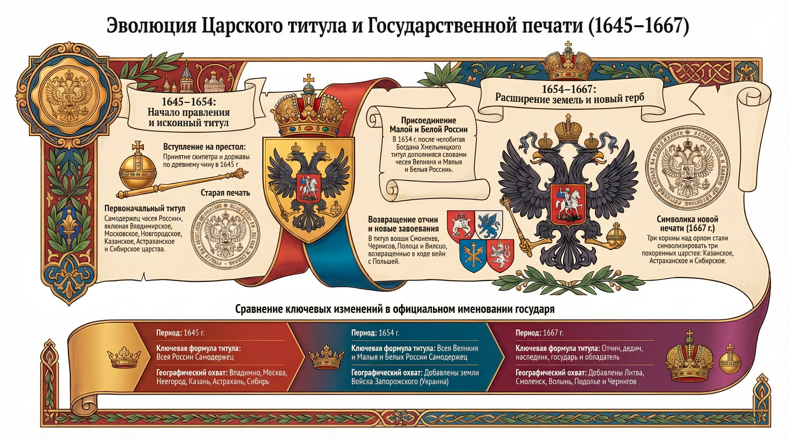 Титул Алексея Михайловича стал «картой» расширения границ. Если в 1645 году он был лаконичным, то после принятия Малороссии и войн с Польшей превратился в мощный манифест. В 1667 году утвердилась формула «всея Великия и Малыя и Белыя России». Новая печать с орлом под тремя коронами закрепила статус державы, став символом геополитического триумфа и превращения страны в мощную евразийскую империю.