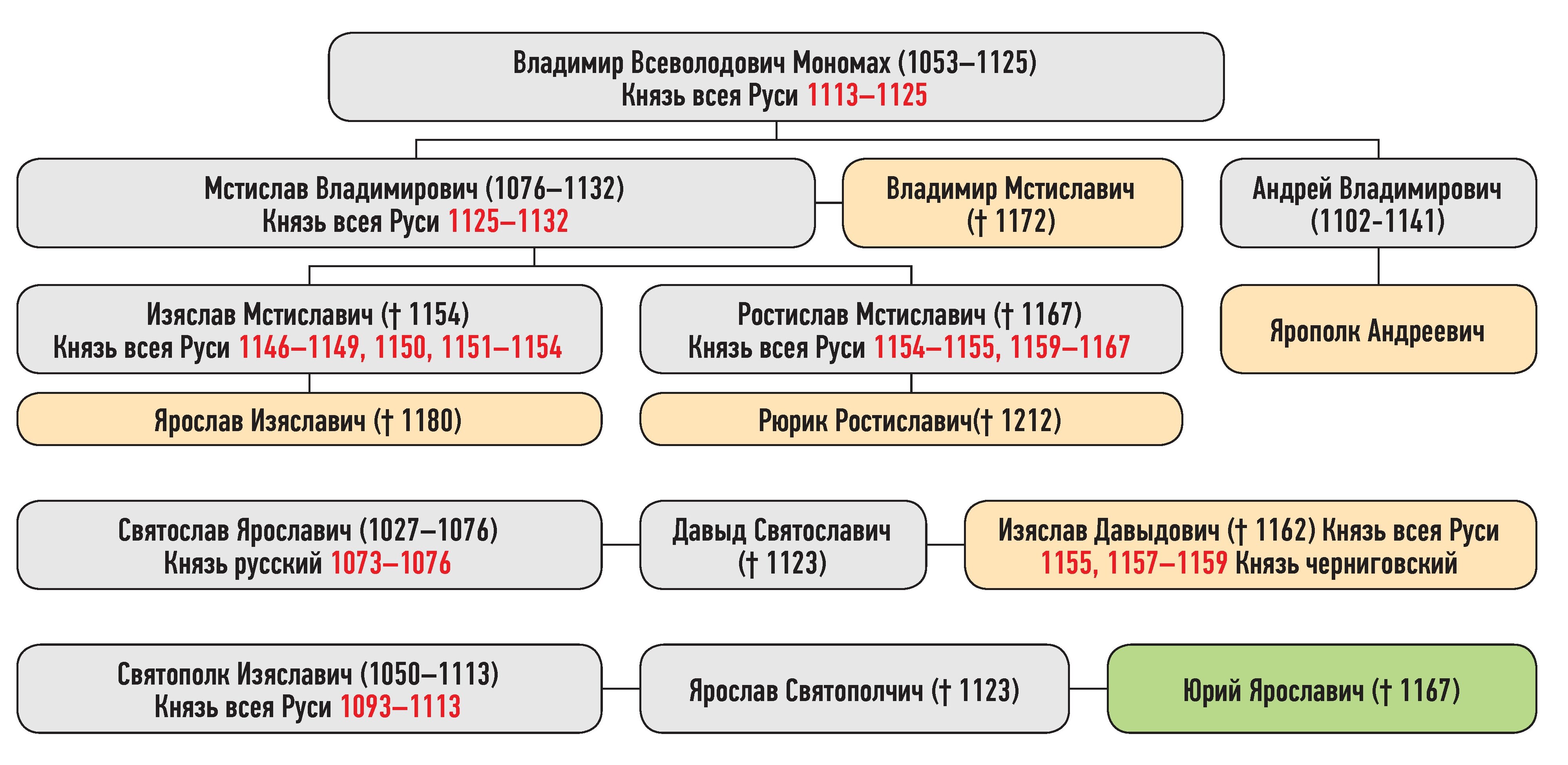 Изяслав Давыдович — сын Давыда Святославича, Ярополк Андреевич — сын Андрея Владимировича, Ярослав Изяславич — сын Изяслава Мстиславича, Рюрик Ростиславич — сын Ростислава Мстиславича, Владимир Мстиславич — сын Мстислава Владимировича, Юрий Ярославович — внук Святополка Изяславича