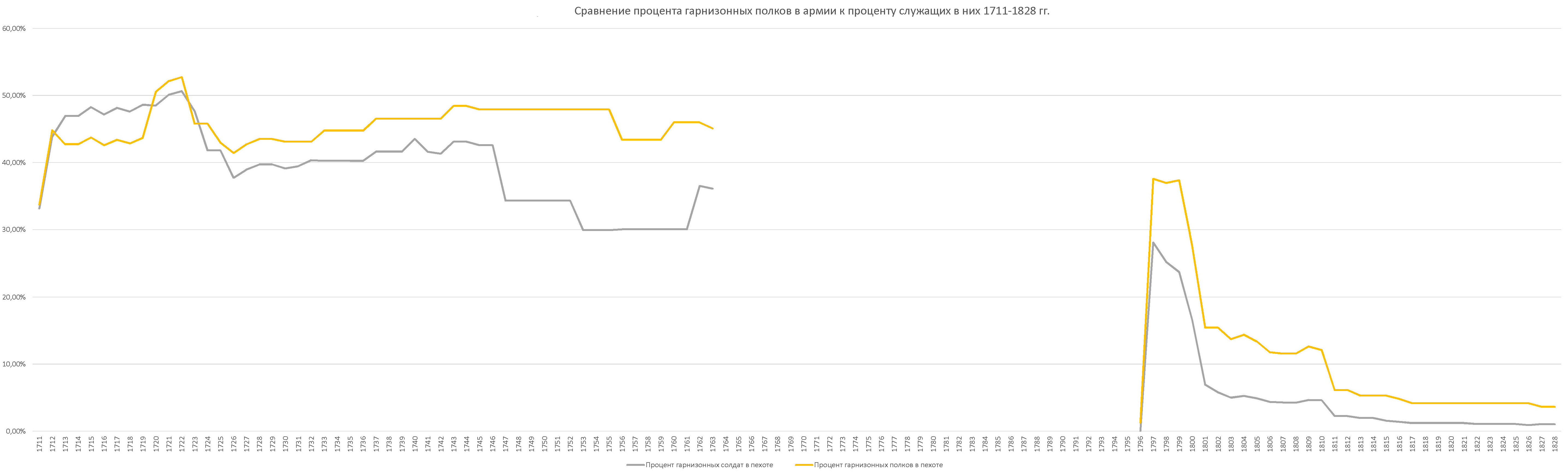 Сравнение процента гарнизонных полков в русской армии к проценту служащих в них