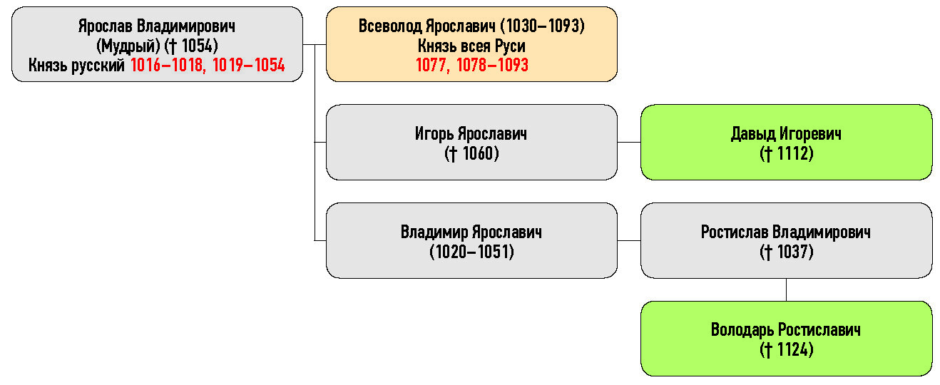 Ярослав Владимирович (Мудрый) († 1054), Всеволод Ярославич (1030–1093) Князь всея Руси, Игорь Ярославич († 1060), Владимир Ярославич (1020–1051), Давыд Игоревич († 1112), Ростислав Владимирович († 1037), Володарь Ростиславич († 1124)