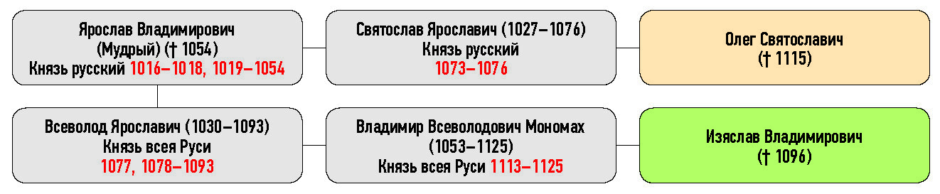 Ярослав Владимирович (Мудрый) († 1054), Всеволод Ярославич (1030–1093) Князь всея Руси, Святослав Ярославич (1027–1076) Князь русский, Владимир Всеволодович Мономах (1053–1125), Олег Святославич († 1115), Изяслав Владимирович († 1096)
