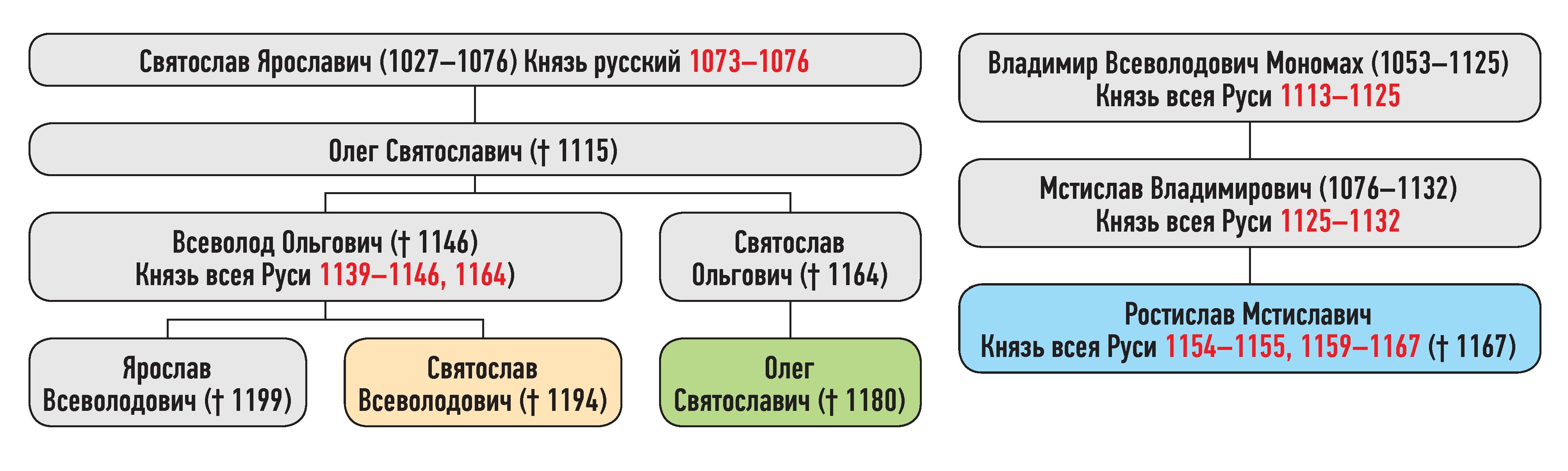 Генеалогическая схема к усобице Святослава Всеволодовича, Олега Святославича и Ростислава Мстиславича в 1167 г.