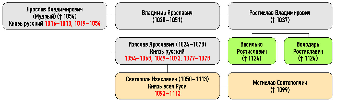 Ярослав Владимирович (Мудрый) († 1054), Владимир Ярославич (1020–1051), Ростислав Владимирович († 1037), Изяслав Ярославич (1024–1078) Князь русский, Василько Ростиславич († 1124), Ростиславич († 1124), Святополк Изяславич (1050–1113) Князь всея Руси, Мстислав Святополчич († 1099)