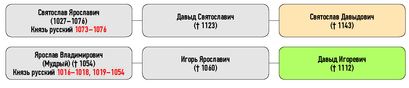 Святослав Ярославич (1027–1076) Князь русский, Давыд Святославич († 1123), Святослав Давыдович († 1143), Ярослав Владимирович (Мудрый) († 1054) Князь русский, Игорь Ярославич († 1060), Давыд Игоревич († 1112)