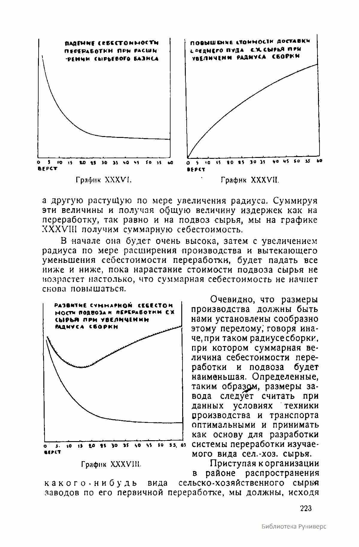График XXXVII. Повышение стоимости доставки среднего пуда сельско-хозяйственного сырья при увеличении радиуса сборки.